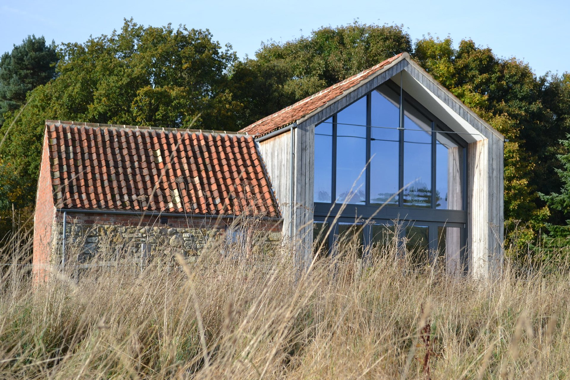 Description: We converted and extended an 18th Century, Grade II listed barn into a contemporary three-bedroom house with attached holiday accommodation. The project included a timber-clad extension to the existing barn, which was sensitively restored using traditional materials and techniques.